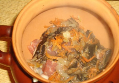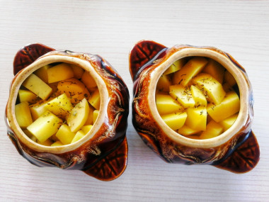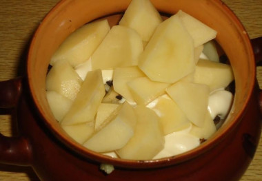 Обжаренные грибы с луком и морковью разложите по горшочкам поверх мяса. Сверху выложите картофель, нарезанный небольшими кусочками. В каждый горшочек налейте немного воды. До целого доливать не надо, иначе она будет выкипать через верх. Наливайте не более половины горшочка.