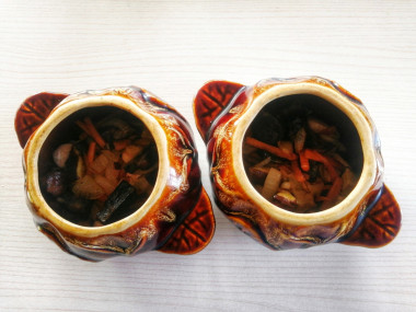 Спустя оказанное время духовку выключите, а дверцу приоткройте. Пусть горшочки немного постоят в остывающей духовке. Минут 20-30 будет достаточно. Жаркое можно подать к столу сразу в горшочках или выложить содержимое на тарелку. Приятного аппетита!