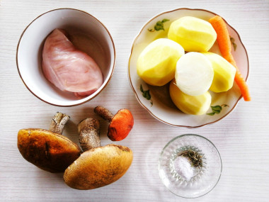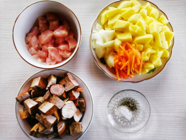 Как сделать жаркое из свинины с картошкой и грибами в горшочках? Подготовьте для этого необходимые ингредиенты. Мясо свинины можно взять с любой части. Желательно выбирать кусочек с меньшим количеством жира, так как при приготовлении бульон получается и без того очень наваристый. В качестве грибов я буду использовать свежие шампиньоны. Но их можно заменить на любые другие на ваш вкус. Овощи очистите и ополосните.