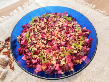 7. Соединить все ингредиенты салата вместе. Смешать свеклу, мясо, белки и маринованные огурцы. Заправить салат приготовленным соусом. Посолить по своему вкусу и размешать. Сверху украсить салат измельченными грецкими орехами.