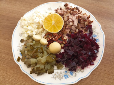 1. Свеклу промыть под холодной водой, поместить в кастрюлю и залить новой водой. Поставить кастрюлю на огонь и отварить до готовности (пока не станет мягкой). Затем остудить, после чего очистить от кожицы и мелко нарезать небольшими кубиками. Чтобы свекла меньше красила остальные ингредиенты салата, следует предварительно промаслить ее. Для этого в миску с нарезанной кубиками свеклой влить 1/5 оливкового масла и хорошо перемешать. Оставить на некоторое время, пока нарезаются другие продукты.