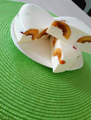 Сверху на абрикосы вылейте сливочно-творожный мусс и разровняйте силиконовой лопаткой.