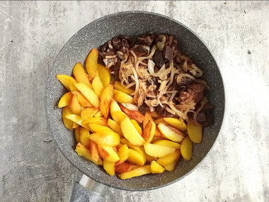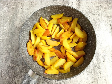 Картошка у меня небольшого размера, нарезала ее дольками. Чтобы картошка хорошо жарилась, нужно ее промыть от крахмала и обсушить полотенцем. Жарила на среднем огне примерно пол часа. Картошка хорошо зарумянилась, стала золотистой! Посолила ее в самом конце и перемешала все продукты. Подержала на сковороде еще минут 5, чтобы вкусы объединились.