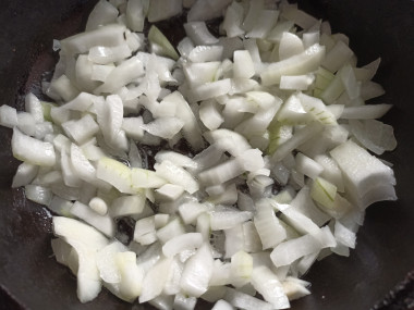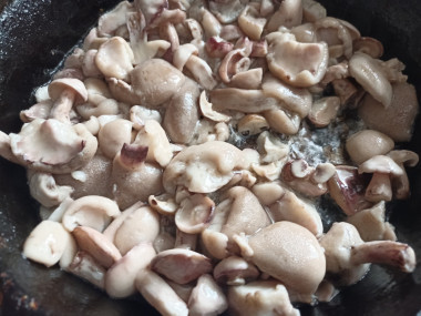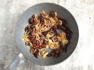Сначала отварила их 15 минут с момента закипания. В это время обжарила лук до золотистого цвета. Затем на той же сковороде обжарила грибы.