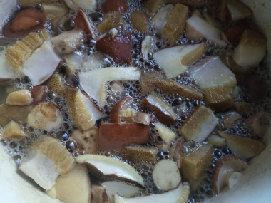 Промытые грибы переложите в кастрюлю, залейте холодной водой, доведите до кипения и добавьте немного соли. Как выбрать кастрюлю для варки грибов читайте в статье под шагами.