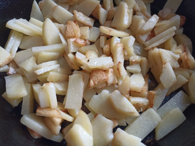 На сковороде, где обжаривали лук или на другой сковороде, разогрейте немного масла. Обжарьте картошку на среднем огне до готовности и румяной корочки, жарьте не накрывая крышкой. Посолите по вкусу. Сорт, качество картофеля влияет на время приготовления, вкус, внешний вид. Для жарки берите картофель с низким содержанием крахмала, если картофель с высоким содержанием крахмала, то можно его предварительно отварить, затем обжарить до румяности.