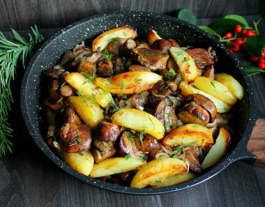 К готовой обжаренной картошке добавьте грибы с луком, бережно перемешайте. Попробуйте на вкус, при необходимости досолите и всё вместе обжарьте минут 5, чтобы все вкусы объединились.