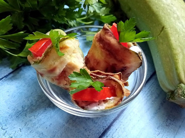 У нас в огороде кусты кабачков неожиданно дали обильный урожай. Хорошо, что на сайте есть много рецептов с участием этого полезного овоща) На этот раз сделала рулеты из кабачков с чесноком. Кабачки старалась нарезать тонко, но так, чтобы не сгорели. Посыпала пластинки солью, после чего выделилось много сока. Удаляла его бумажными полотенцами. Решила жарить кабачки предварительно обваляв их в муке, чтобы точно не пригорели. В начинку добавила побольше чеснока, из зелени взяла петрушку для аромата. Из специй свежемолотая смесь перцев. Кабачки жарятся быстро. Лишний жир удаляла тоже бумажными полотенцами. Рулетики крутятся моментально, еще быстрее съедаются) Подавать их лучше сразу, т. к. мучной кляр может отсыреть и это повлияет на вкус. Нам с мужем такая закуска понравилась, она острая, ароматная, вкусная и помидорчик отлично дополняет и освежает. Рецепт рекомендую!