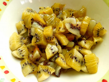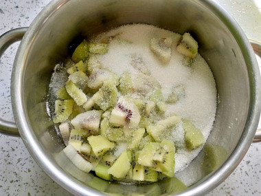 Засыпьте киви сахаром, потрясите, чтобы сахар равномерно распределился между всеми кусочками. В таком виде оставьте плоды на несколько часов, чтобы киви пустили сок. Лучше всего это сделать на ночь.