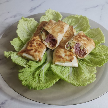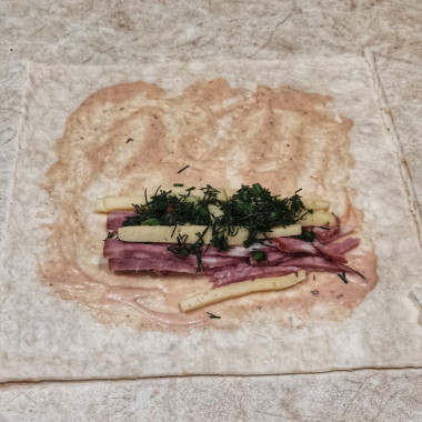 По этому рецепту можно очень быстро приготовить вкусную закуску используя то, что есть в холодильнике. Получится достаточно сытно. Такие конвертики из лаваша с колбасой и сыром вкусные и горячими, и холодными! Сложила лаваш просто рулетом. Хорошая замена приевшимся бутербродам с колбасой и сыром.