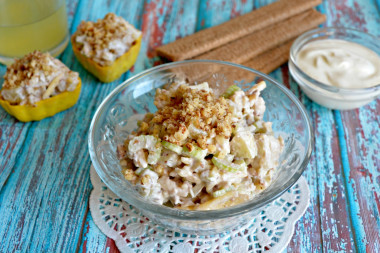 Выложите салат горкой на тарелку и посыпьте измельченными грецкими орехами. Салат с сельдереем, ананасом и яблоком подайте к столу. Приятного аппетита!