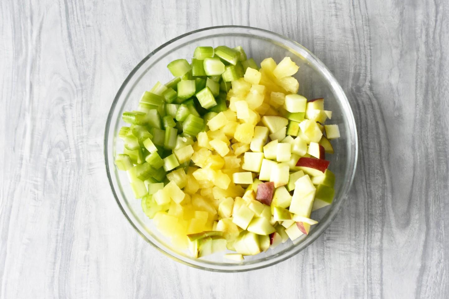 Шаг 4. Как подготовить и нарезать сельдерей, яблоки и ананасы?