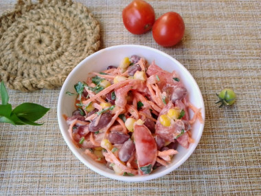 С кукурузы слейте жидкость, удобнее будет это сделать, откинув ее на сито. Также поступите с фасолью. Сложите в салатник кукурузу, фасоль, добавьте корейскую морковь и нарезанные помидоры. Также вы можете добавить в салат любую свежую зелень по вкусу — петрушку, укроп, базилик.