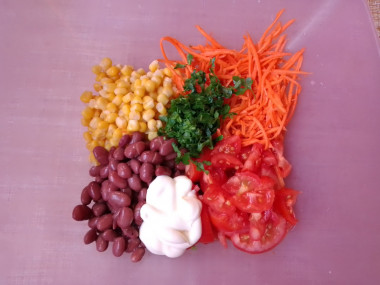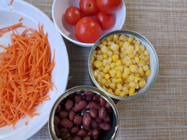 Приготовила все ингредиенты. Фасоль и кукуруза у меня из баночек. Морковь по корейский домашнего приготовления.