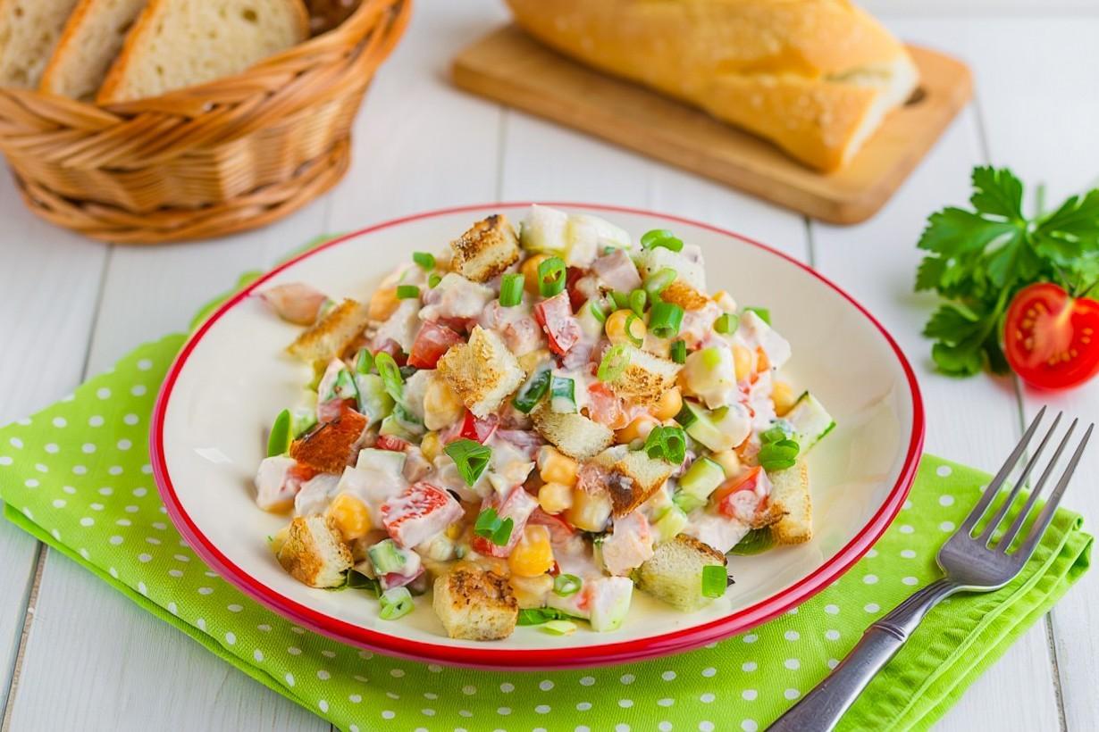 9. Перед подачей посыпать салат приготовленными заранее сухариками из белого хлеба. Следует учитывать тот факт, что если сухарики положить сразу, то они размокнут и будут мягкой консистенции.