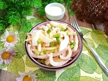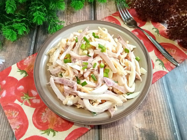 Кальмаров по одному выкладывала в кипяток и варила ровно одну минуту. Затем остудила, почистила и нарезала соломкой. Твердый сыр натерла на крупной тёрке. Яйца решила нарезать соломкой. Желток плохо держит форму, поэтому в следующий раз нарежу белок, а желток покрошу сверху в качестве украшения. Я добавила в салат зеленый лук, чтобы разбавить свежей остринкой эту невероятную нежность). Заправляла салат сметанным майонезом.