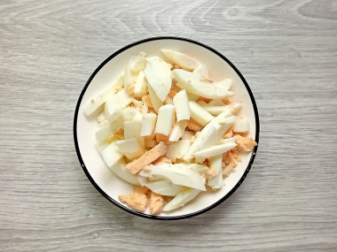 Яйца отварите. Как сварить яйца вкрутую? Положите их в холодную воду, поставьте варить на небольшой огонь. Варите яйца 9 минут после закипания, затем залейте холодной водой и остудите. От резкого перепада температур скорлупа лучше очистится. Охладите и очистите их от скорлупы. Нарежьте небольшими кубиками.