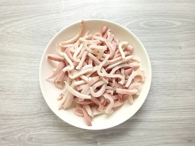 Готовые кальмары выньте из кипятка и охладите. Нарежьте их соломкой.