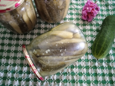 Заготавливала огурцы в горчичной заливке на зиму по этому рецепту. Действительно очень простая и быстрая заготовка. Предварительно я огурчики замочила в холодной воде на 6 часов, чтобы были хрустящими. Порезала огурцы не кружочками, а соломкой и замариновала. Зелень не добавляла по своим соображениям. Положила измельчённый чеснок по рекомендации автора. Для горчичной заливки взяла соль, черный свежемолотый перец, сахарный песок, подсолнечное масло без запаха, уксус 9% и крепкую готовую горчицу 1 ст.л. вместо порошка. Мариновались мои огурчики 3 часа, пустили достаточное количество сока. Плотно уложила огурцы в стерильные банки и залила получившимся соком. Стерилизовала в кипящей воде пол литровые баночки 15 минут и закатала.