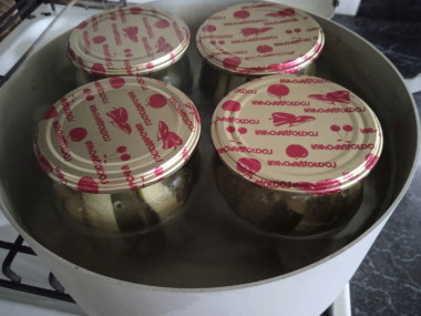 Накройте банки крышками, кастрюлю поставьте на плиту, после закипания воды стерилизуйте банки объемом 0,5 л 10-15 минут, 1-1,5 л 15-20 минут, 2-3 л 20-30 минут. После сразу закатайте банки крышками.