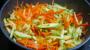 Следом в сковороду добавьте нашинкованные овощи и также быстро обжарьте на сильном огне.