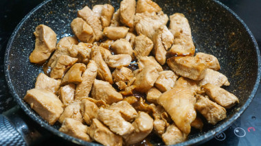 На сильном огне в сковороде вок или в сковороде с толстым дном разогрейте растительное масло и быстро обжарьте брусочки куриного филе.