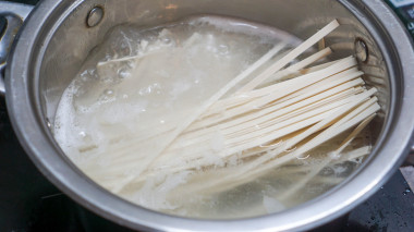 В кастрюлю налейте воду, доведите её до кипения и добавьте соль. В кипящую воду положите лапшу и варите примерно 5-7 минут, иногда помешивая ее, чтобы лапша не слиплась.
