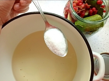 Красной смородины кладут столько, чтобы не понадобился уксус, ее кислота в этом случае служит дополнительно, в крайнем случае чуток лимонки добавить. А смородиной еще и огурцы пропитываются в этом случае, у вас слишком мало ягоды - для красоты, что ли? на 2-х литровую банку обычно 1-1,5 стакана уходило. По крайней мере, у нас распространен именно такой способ, вот попробуйте.Существуют разные редакции этого рецепта. Спасибо, можно попробовать и ваш вариант