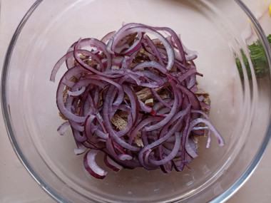 Красный салатный лук почистите, сполосните и нарежьте тонкими полукольцами. Разберите его на отдельные полоски и добавьте к мясу.