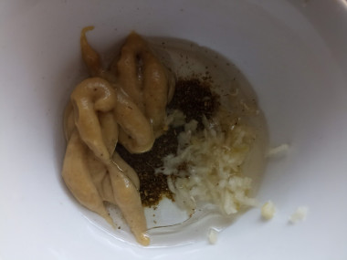 В другую миску положите готовую горчицу, измельченный чеснок, кавказские травы и черный молотый перец.