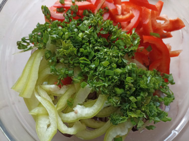 Болгарский перец вымойте, обсушите и отрежьте плодоножки. Удалите у перцев семена, порежьте соломкой и положите в салат. Зелень мелко порежьте и добавьте к овощам и мясу.