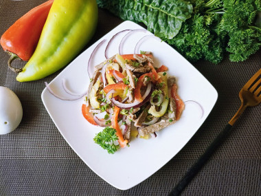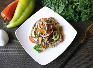 Приготовила салат кавказский с говядиной и болгарским перцем. Кусочек постной говядины отварила заранее. Нарезала мясо, болгарский перец, красный лук, зелень ( петрушка и зелёный лук). Приготовила аппетитнейшую заправку из растительного масла, столового уксуса, чеснока, готовой горчицы, перца и специй. С удовольствием буду готовить этот салат ещё много раз, полезное и очень вкусное сочетание мяса и овощей с пикантной острой заправкой. Рекомендую приготовить! Спасибо за рецепт, Лялич!