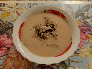 Перед подачей на стол, в тарелку сначала наливаем пюре, а сверху добавим перловку с зеленью. Вот суп и готов. Приятного аппетита.