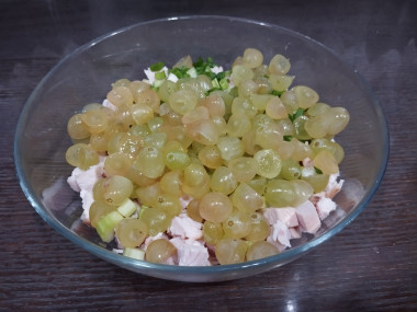 Салат с копчёной курицей и виноградом разложите по тарелкам и сверху украсьте зеленым луком. Приятного аппетита!