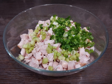 В глубокую миску листья салата, курицу и сельдерей. Слегка перемешайте.