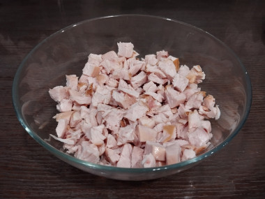 Копченую курицу нарежьте на кусочки среднего размера. Их форма может быть произвольной - это могут быть брусочки или кубики.