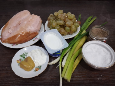 Заинтриговал рецепт: салат с копчёной курицей и виноградом. Интересно было попробовать сочетание таких ингредиентов.