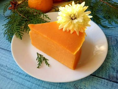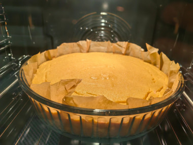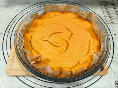 Сразу хочу сказать спасибо автору рецепта простого тыквенного пирога с творогом и тыквой в духовке! Этот пирог не похож ни на что из того, что я когда-либо пекла. Ни пирог (бисквитный или кексовый), ни творожная запеканка не сравнятся с нежнейшей консистенцией этой выпечки. Действительно чем-то напоминает чизкейк. Срез идеально гладкий. Не смотря на нежность пирога, нарезается он отлично, кусочки ровные. Да и сам пирог легко переложить на тарелку. Выпекала я его в кольце диаметром 20 см. В высоту он получился 4,5 см. Кольцо обернула фольгой снизу и промазала дно и бока растительным маслом. Бортики дополнительно выложила полосками пергамента. Выпекала строго по указаниям в рецепте. После духовки пирог остывал на столе в кольце, потом кольцо сняла и убрала пирог в холодильник. Чтобы не заветрился соорудила колпак из фольги.