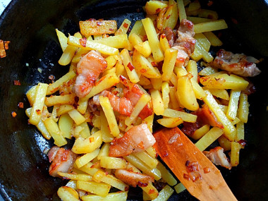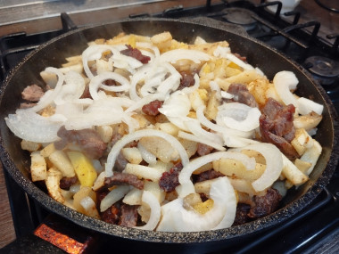 Перемешайте картошку и добавьте лук в сковороду поверх картошки, но не перемешивайте, чтобы он не пригорел, до того как приготовится картошка. Лук придаст сладковатый привкус этому блюду. Пусть готовится еще примерно 5-7 минут. Затем тщательно перемешайте.