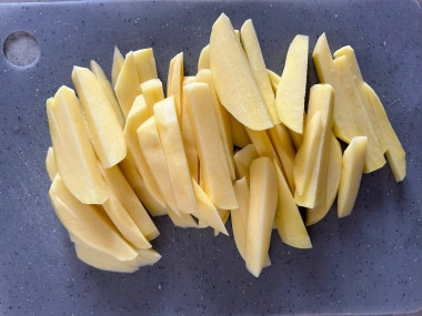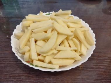Почистите картошку, помойте и порежьте соломкой. Так будет смотреться очень аппетитно.