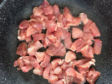 Выложите кусочки свинины на разогретую сковороду с растительным маслом. Если вы хотите, чтобы весь сок мяса пошел на картошку, то кладите на не сильно разогретую сковороду и жарьте на медленном огне. Если вы хотите, чтобы побольше сока осталось в мясе и оно было более сочным, тогда выкладывайте его на хорошо разогретую сковородку, чтобы сразу образовалась золотистая корочка с двух сторон и затем уменьшите огонь. Тогда больше сока останется в мясе.