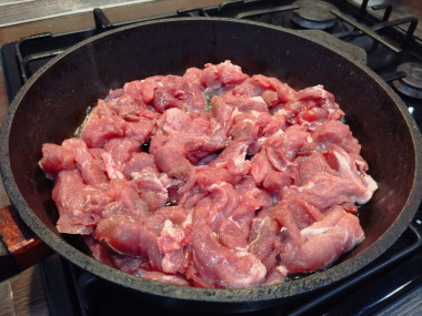 Свинину нарежьте тонкими кусочками. Помимо свинины в этом блюде можно использовать любое другое мясо. Учитывайте, что время приготовления, а также вкус и калорийность блюда изменятся. Например, говядина готовится дольше, чем свинина, а куриное филе или индейка меньше.