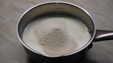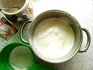 В сотейник влейте молоко, всыпьте сахар, муку и ванилин и перемешайте венчиком, разбивая все комочки, до однородности. У меня вместо ванилина ванильный ароматизатор. Если у вас нет ничего из этого, можете добавить 1 ст. л. ванильного сахара.