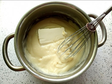 Добавьте в горячий крем сливочное масло и перемешайте венчиком или взбейте миксером на низкой скорости. Масло должно полностью разойтись по крему. Если после добавления масла крем разжижился сильнее, чем вам необходимо, можете снова поставить сотейник на огонь и, постоянно помешивая, уварить крем до нужной густоты. Можете сначала полностью охладить крем, а потом вмешать в него мягкое сливочное масло.