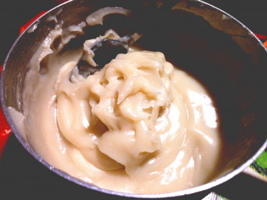 - Дайте загустеть основе крема при варке (мука или крахмал, которые берутся в зависимости от рецептуры в качестве загустителей, должны завариться, но следите, чтобы будущий крем не пригорел и не было комков).
