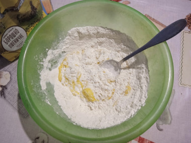 Влейте жидкую смесь в миску с мукой. Перемешайте лопаткой ингредиенты, чтобы они начали собираться в густое тесто.