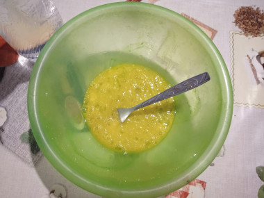 В другую миску вбейте куриное яйцо, разболтайте его вилкой или венчиком, чтобы белок полностью разошелся.