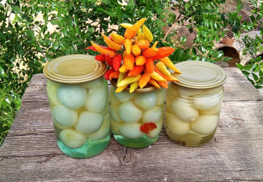 Пока закатывала помидоры решила заодно заготовить немного маринованного лука. Купила специально мелкий лук, чтобы было красиво и удобно. Воспользовалась рецептом и из 1 кг. лука получились вот такие баночки, две пол литровые и одна семьсот мл. Чистить такое количество лука то еще испытание, поэтому спасалась как могла: очищенный лук опускала в миску с холодной водой, нож после каждой луковички тоже споласкивала холодной водой. Воду в миске периодически меняла.