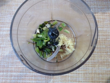 И, наконец, главный виновник торжества - свежий корень имбиря! Помойте его, ножом срежьте кожицу и натрите на мелкой тёрке. Постарайтесь на глаз определить слишком длинные и жёсткие имбирные волокна и удалите их, чтобы потом они не помешали вам в салате. Отправьте имбирь в блендер.