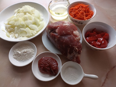 Приготовила гуляш с рисом. Свинину нарезала кусочками, обжарила на растительном масле, добавила к ней нарезанные овощи ( лук, морковь, болгарский перец), обжарила всё вместе, затем добавила немного горячей воды и тушила под крышкой на слабом огне до готовности мяса. Томатную пасту перемешала с пшеничная мукой, развела водой, влила томатную смесь в сковороду с мясом и овощами, протушила всё вместе. Для гарнира взяла длиннозерный пропаренный рис. Вкусно, сытно! Спасибо автору за рецепт!